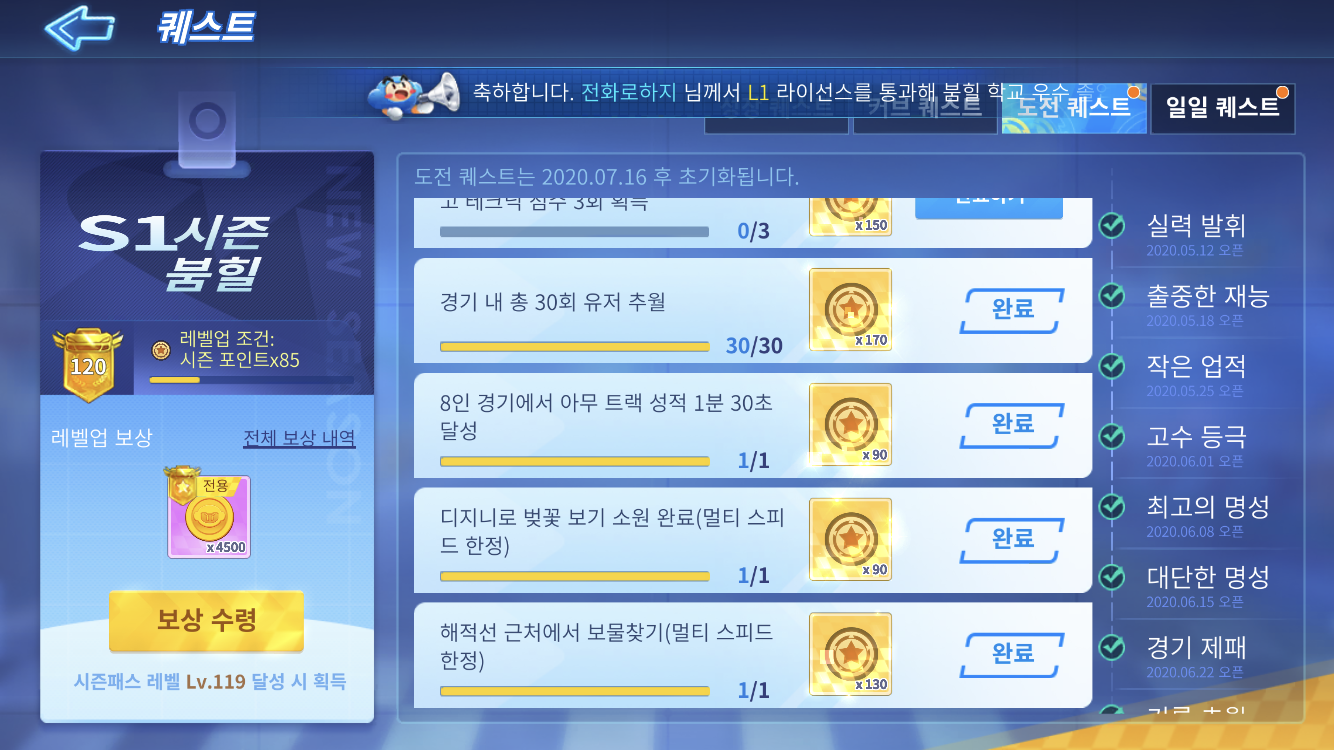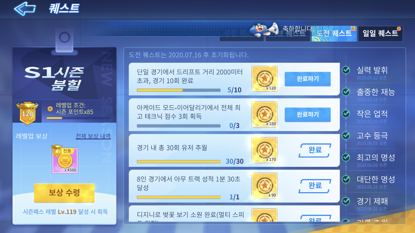 - 8인 경기에서 아무 트랙 성적 1분 30초 달성