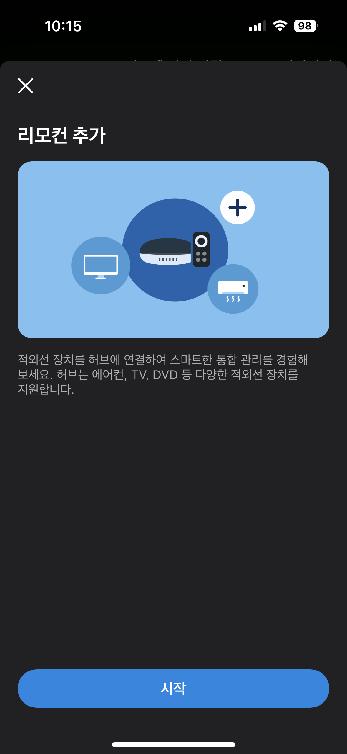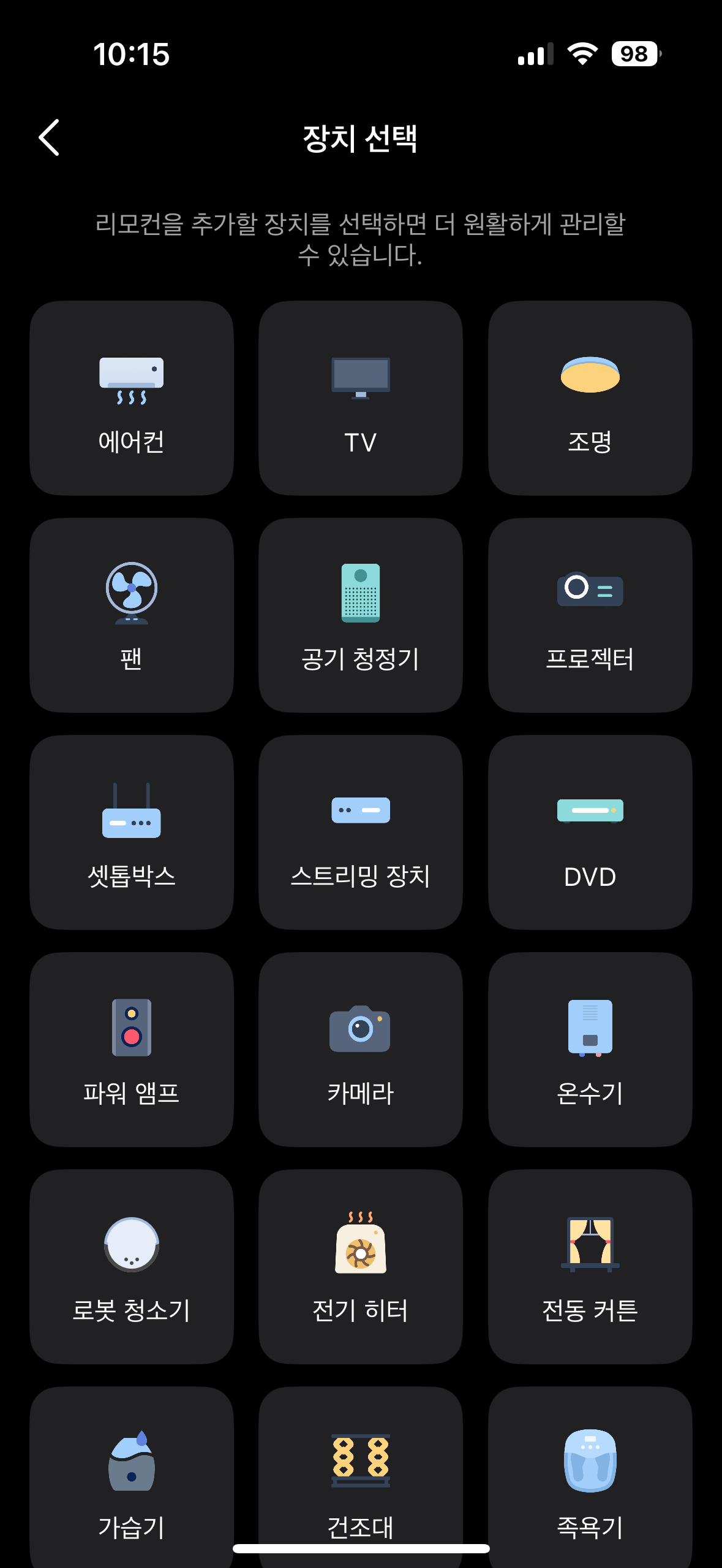 추가된 IR 허브로 들어가서 허브에 연결할 기기를 선택 하는 화면에서
