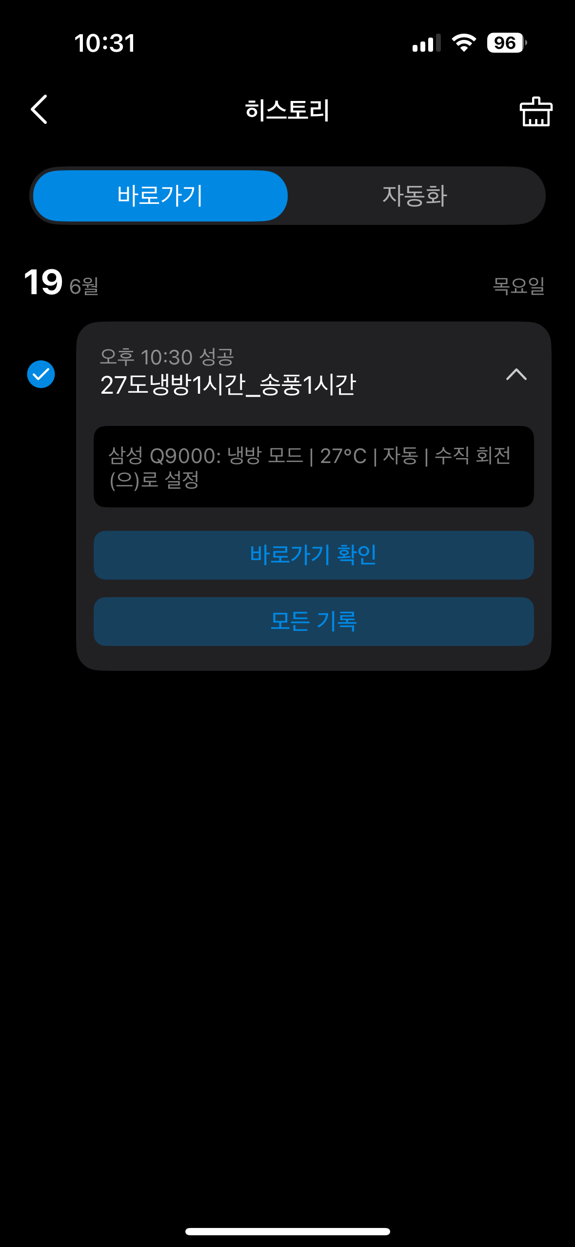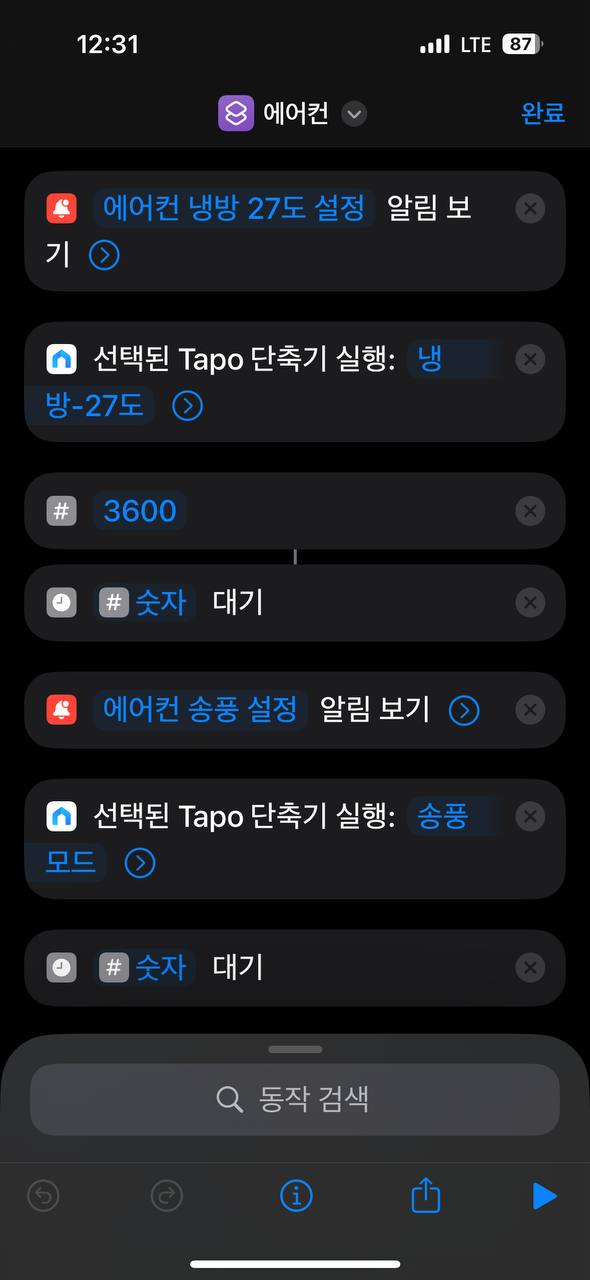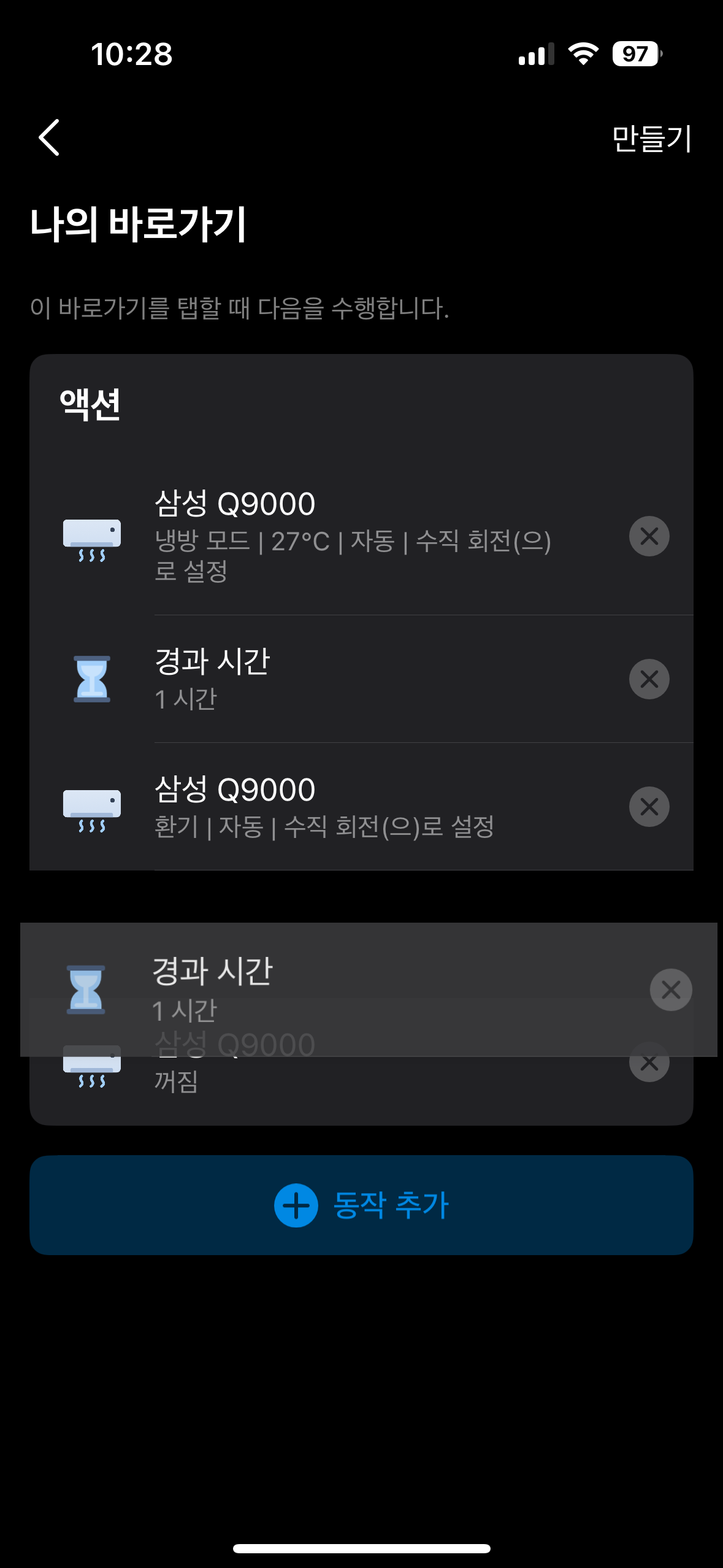 여러 액션들을 조합하여 위와 같이 27도 냉방을 1시간 유지 후 송풍 1시간 유지 후 에어컨 전원 끄기 등의 스마트 액션을 만들수 있다.